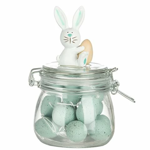 Richie Rabbit sits pretty this Easter on top of an egg filled storage jar and he’s clutching an Easter egg himself for good measure.