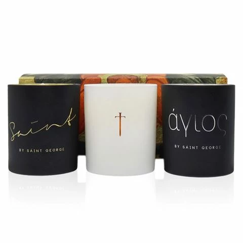 The three mini candles in a custom designed box allows you to experience Saint George’s favourite home scents including Livani, Ayios and Saint.